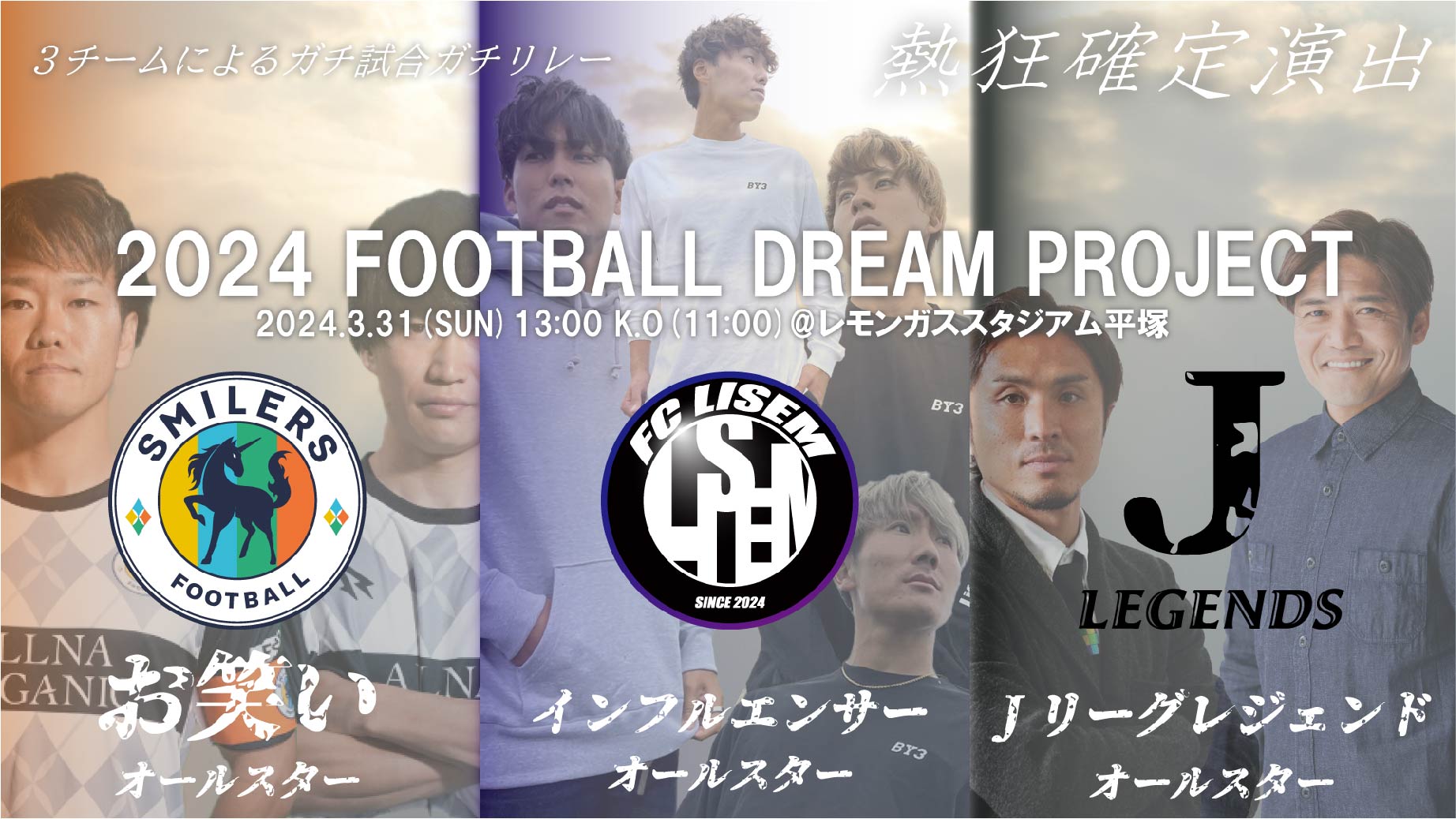 2024年3月31日(日)にレモンガススタジアム平塚にて開催を予定しており、レジェンドと呼ばれる元Jリーガー(那須大亮氏、大久保嘉人氏、柏木陽介氏など)の他、人気サッカー系YouTuber、サッカーお笑い芸人オールスターのメンバーが、試合やチーム対抗リレーで三つ巴の熱い戦いを繰り広げます。