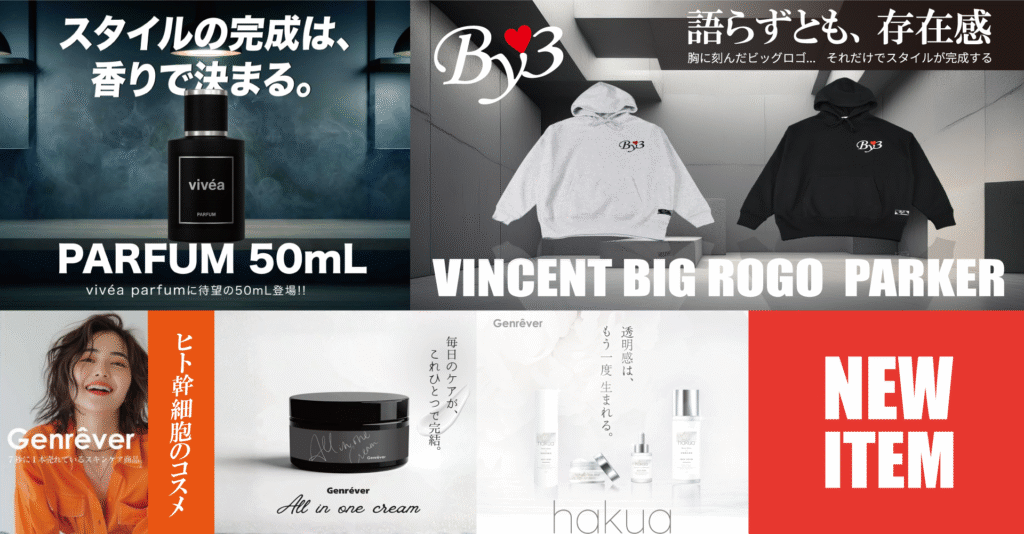 アパレルブランド「By3」、LISEMプロデュースコスメ「Vivea」、ヒト幹細胞培養液を配合したスキンコスメ「Genrêver」が新たにラインナップし、サービス内容を一層充実させ、これまで以上に皆さまにご満足頂けるお店づくりを目指して参ります。